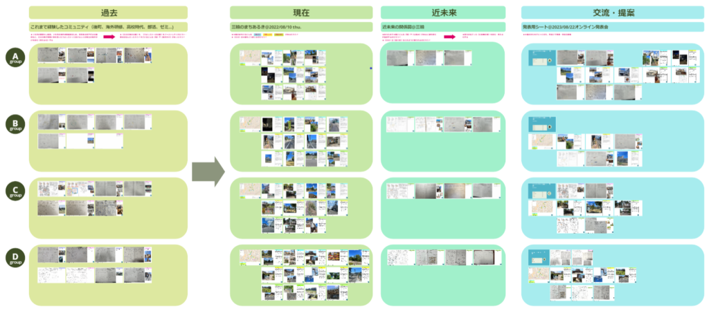 2023年8月の集中講義「コミュニティデザイン各論I」で作成したワークシート一式(@MIRO)を公開いたしました。環境によっては少々表示に時間がかかるかもしれませんが、クローズアップしていただきますと、充分に1枚1枚のワークシートの描き込みを読み取っていただけます。